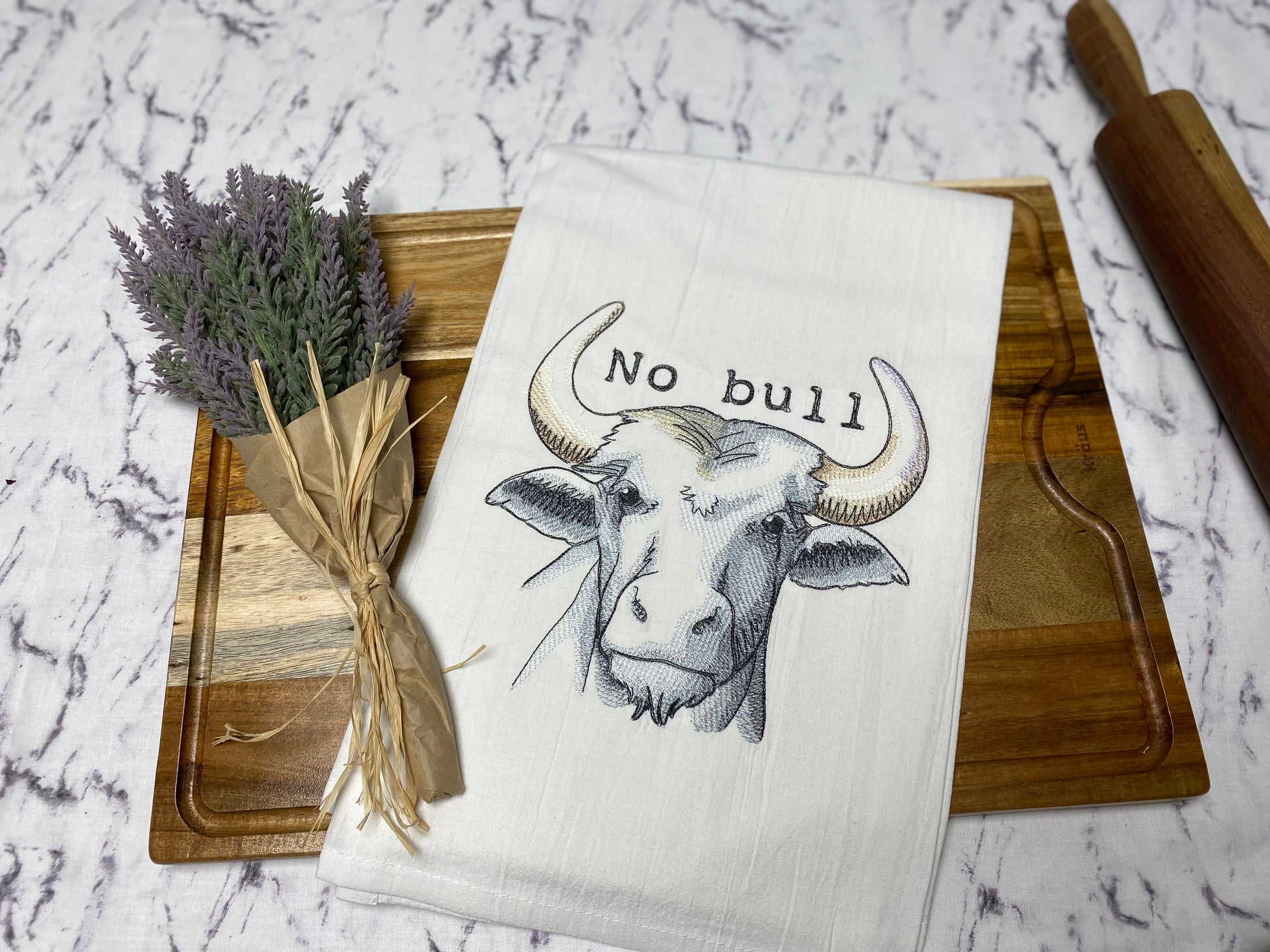 This embroidery design is stitched on a 28" X 28" white cotton flour sack dish towel.